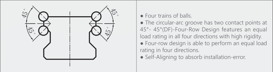 - Thiết kế 4 rãnh bi hướng tâm 45°, vận hành ổn định theo nhiều hướng: ngang, dọc, thẳng đứng hoặc treo ngược.