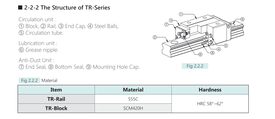 - Thanh trượt vuông: thép S55C, xử lý nhiệt cao tần, độ cứng rãnh bi 58 – 62 HRC.