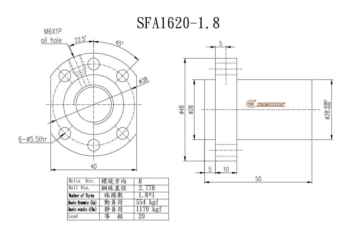 Thông số kỹ thuật Đai Ốc Vitme Bi SFAR01620A1D TBI MOTION