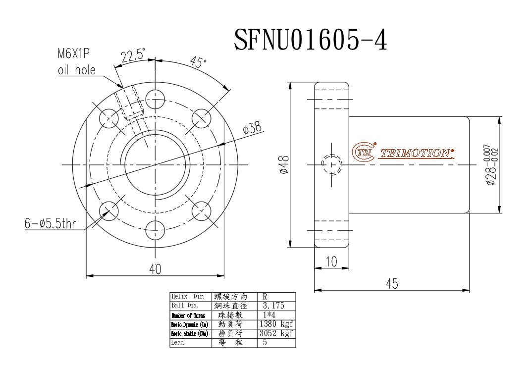 Thông số kỹ thuật Đai Ốc Vitme Bi SFNUR01605T4D TBI MOTION