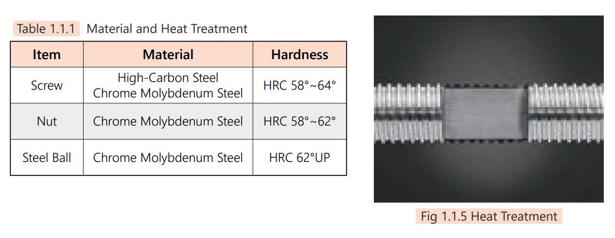 Vật liệu Trục vitme (Screw): Thép carbon cao / Thép hợp kim Crom – Molypden, Độ cứng: HRC 58 – 64